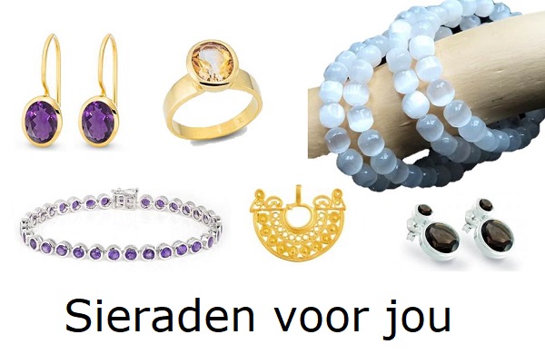 Dit zijn o.a. Oorbellen met edelstenen, kralen, ringen met edelstenen, colliers, hangers, Barnsteen sieraden en armbanden.