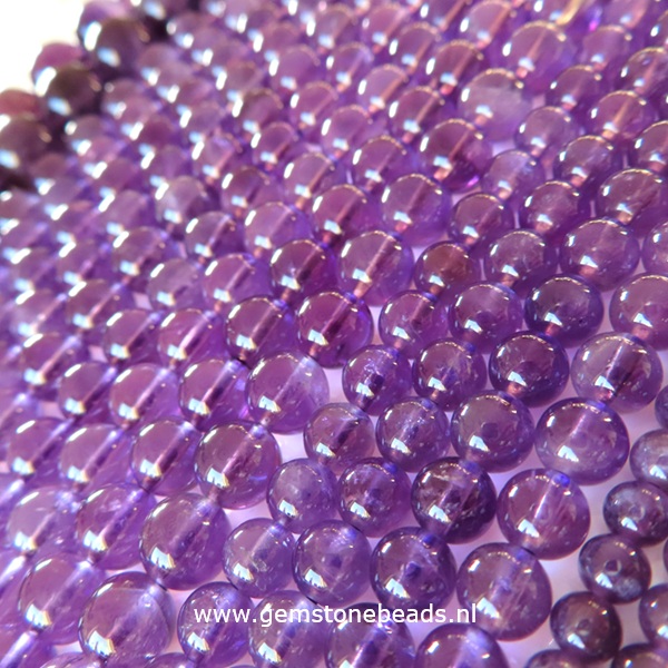 Amethist is een lila tot donkerpaarse, doorzichtige steen met een glasachtige glans. Hij heeft zijn kleur te danken aan Mangaan dat aan de top van de kristallen het sterkst is.
