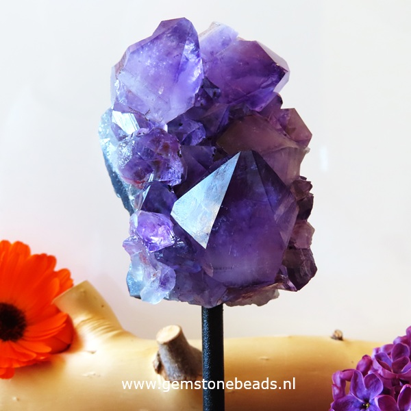 Amethist is een lila tot donkerpaarse, doorzichtige steen met een glasachtige glans. Hij heeft zijn kleur te danken aan Mangaan dat aan de top van de kristallen het sterkst is.
