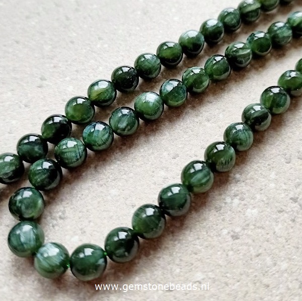 Serafiniet is kleurloos, tot groen, zilver/bruin en heeft een glazig parelmoerglas. Serafiniet is een zachte steen die op fluweel lijkt wanneer het gepolijst is.